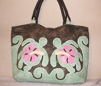 ★色合いをとても気に入られてほとんど毎日使ってくださっているそうです(^^)キルト作品はハワイアンなお花と一緒に写ると更に素敵に見えますよね〜!!見事に咲いたエントラがとっても美しいけれど、バッグも負けていませんよ(^_^)v画像にマウスを当ててバッグの拡大写真も見てね。