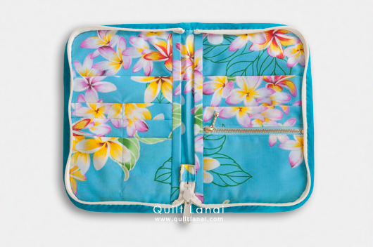 ・モチーフしつけ済み表布 ・キルト芯 ・裏打ち布(生成 無地) ・仕切り布用ハワイアンプリント ・パイピング布 ・ファスナー2本 ・作り方説明書 ・キルトライン図