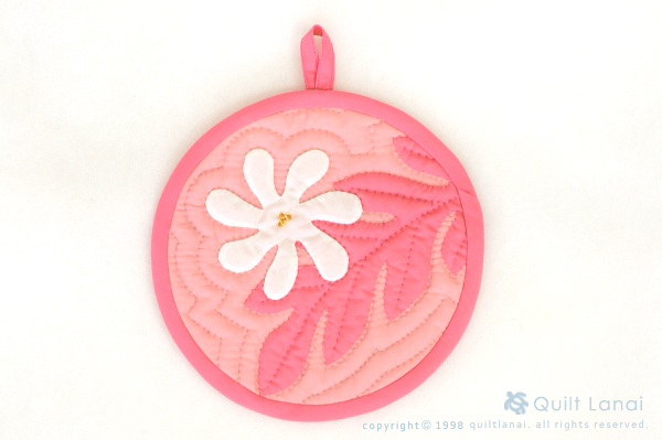 ・モチーフしつけ済み表布 ・キルト芯 ・裏打ち布(ハワイアンプリント) ・ビーズ ・仕立て済みループ ・パイピング用布 ・作り方説明書 ・キルトライン図。