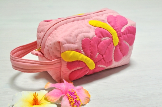 お客さまからのリクエストが多かったハイビスカスのスクエアポーチL。見本はピンクの濃淡で女の子らしく出来上がりました。プルダウンよりお好きなカラーをお選びください。糸つきキット1点または糸なしキット2点までネコポス便発送可能です。