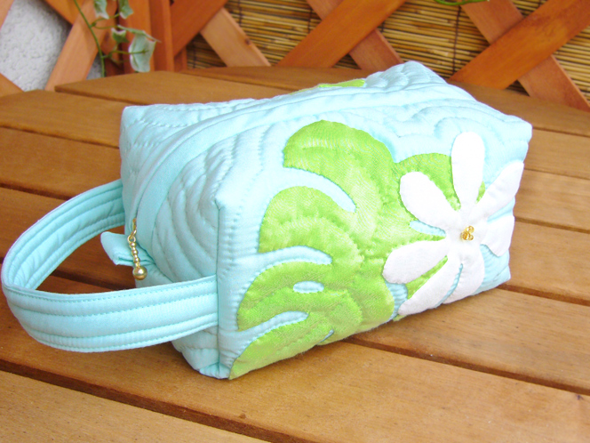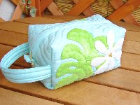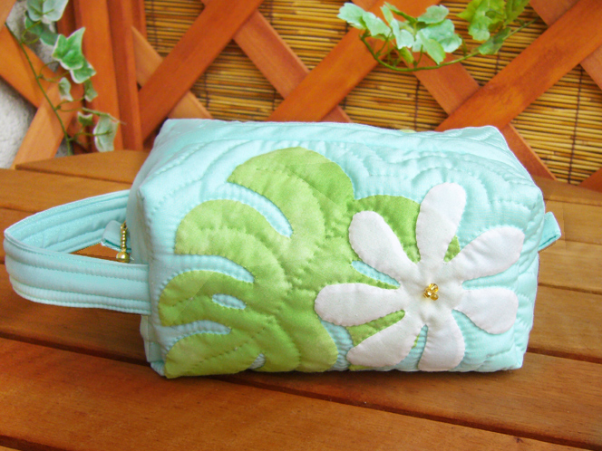 モンステラとティアレの組合せは、ハワイアンキルトでもハワイアンファブリックでもとっても人気です。大きめのモチーフをどどーんとアップリケしてみました。プルダウンよりお好きなカラーをお選びください。糸つきキット1点または糸なしキット2点までネコポス便発送可能です。