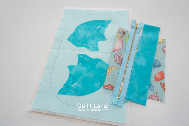 ・モチーフしつけ済み土台布 ・キルト芯 ・裏打ち布(生成無地) ・袋布用ハワイアンプリント ・パイピング用布 ・ファスナー(20㎝) ・作り方説明書 ・キルトライン図。