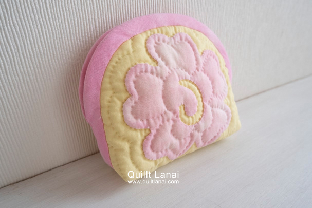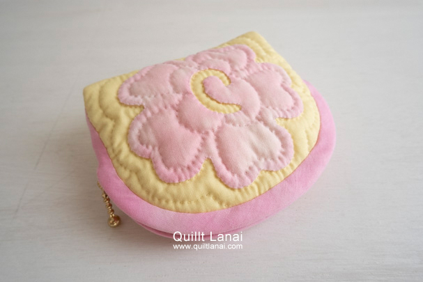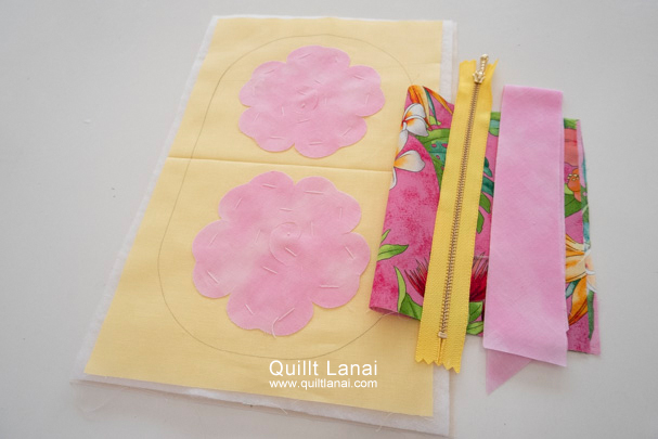 ・モチーフしつけ済み土台布 ・キルト芯 ・裏打ち布(生成無地) ・袋布用ハワイアンプリント ・パイピング用布 ・ファスナー(20㎝) ・作り方説明書 ・キルトライン図
