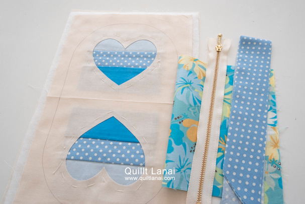 ・モチーフしつけ済み土台布 ・キルト芯 ・裏打ち布(生成無地) ・袋布用ハワイアンプリント ・パイピング用布 ・ファスナー(20㎝) ・作り方説明書 ・キルトライン図