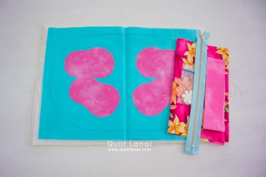・モチーフしつけ済み表布 ・キルト芯 ・裏打ち布(生成無地) ・袋布用ハワイアンプリント ・パイピング用布 ・レザーモチーフとビーズ ・ファスナー(25㎝) ・作り方説明書 ・キルトライン図