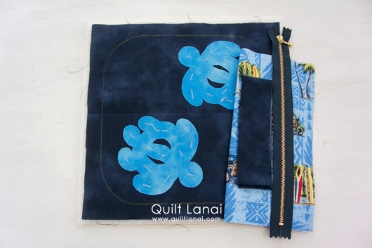 ・モチーフしつけ済み表布 ・キルト芯 ・裏打ち布(生成無地) ・袋布用ハワイアンプリント ・ファスナー ・パイピング ・作り方説明書 ・キルトライン図