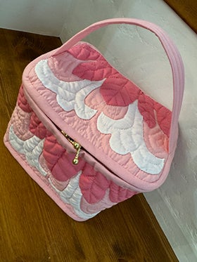 ・モチーフしつけ済み土台布 ・キルト芯 ・裏打ち布(生 成無地) ・袋布用ハワイアンプリント ・仕立て済み持ち手 ・パイピング4本 ・隠し布 ・ファスナー2本 ・作り方説明書 ・キルトライン図