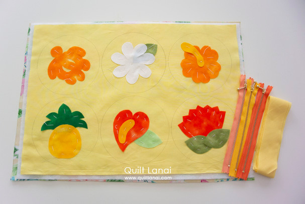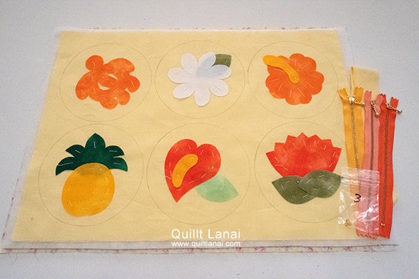 ・モチーフしつけ済み土台布 ・キルト芯 ・裏打ち布(プリント生地) ・パイピング ・ファスナー3本 ・ビーズ(ティアレのみ) ・作り方説明書 ・キルトラ イン図。