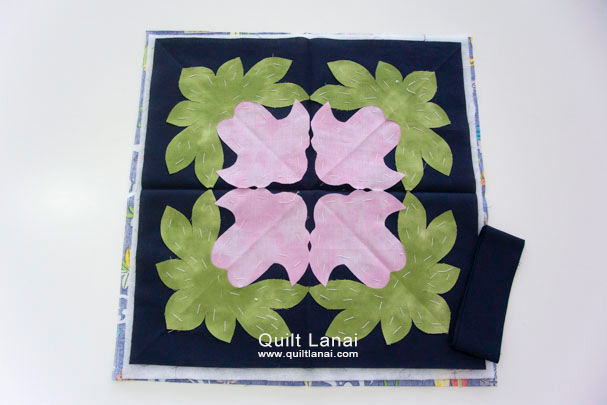 ・モチーフしつけ済み土台布 ・キルト芯 ・裏打ち布(ハ ワイアンプリント) ・パイピング布 ・作り方説明書 ・キルトライン図。