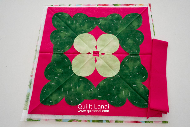 ・モチーフしつけ済み土台布 ・キルト芯 ・裏打ち布(ハ ワイアンプリント) ・パイピング布 ・作り方説明書 ・キルトライン図。
