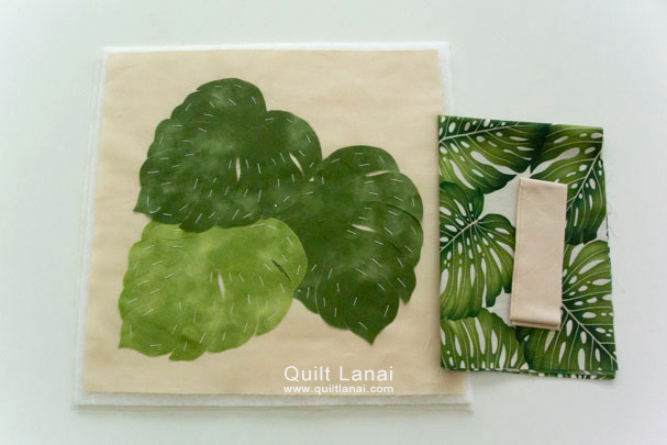 ・モチーフしつけ済み土台布 ・キルト芯 ・裏打ち布(生 成無地) ・クッション用当て布(ハワイアンプリント) ・パイピング用布 ・作り方説明書 ・キルトライン図。