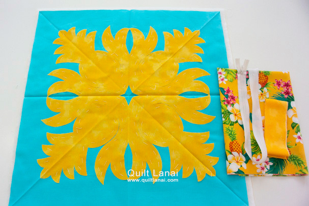・モチーフしつけ済み土台布 ・キルト芯 ・裏打ち布(生 成無地) ・クッション用裏当て布(ハワイアンプリント) ・ファスナー ・パイピング用布 ・作り方説明書 ・キルトライン図