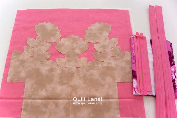 ・モチーフしつけ済み表布 ・キルト芯 ・裏打ち布(生成 無地) ・仕立て済み持ち手 ・見返し布 ・接着芯 ・袋布用ハワイアンプリント ・ファスナー ・作り方説明書 ・キルトライン図。