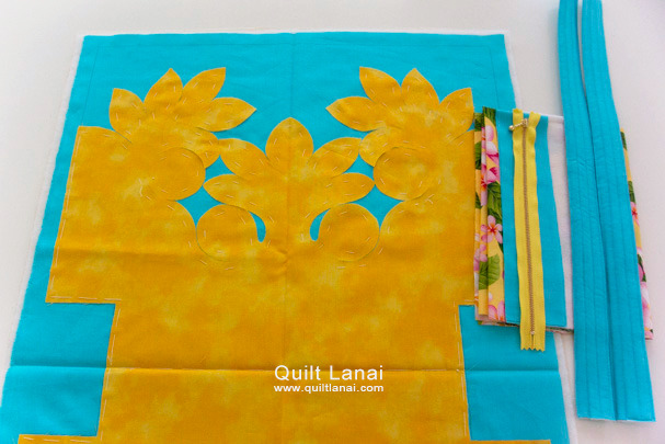 ・モチーフしつけ済み表布 ・キルト芯 ・裏打ち布(生成 無地) ・仕立て済み持ち手 ・見返し布 ・接着芯 ・袋布用ハワイアンプリント ・ファスナー ・作り方説明書 ・キルトライン図。