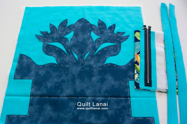 ・モチーフしつけ済み土台布 ・キルト芯 ・裏打ち布(生成無地) ・仕立て済み持ち手 ・見返し布 ・接着芯 ・袋布用ハワイアンプリント ・ファスナー ・作り方説明書 ・キルトライン図