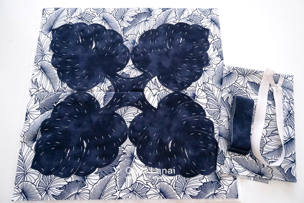 *クッション用裏当て布は土台布と同じハワイアンプリント(リーフ柄ネイビー)をお付けいたします。