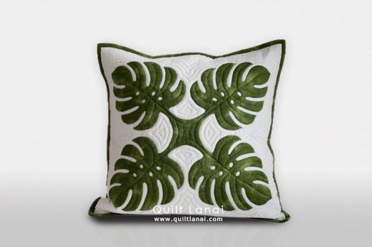 ホワイト地にネイビーで描かれたリーフ柄のハワイアンプリントを土台布に使用した、モンステラのクッションのセット済みキットです。