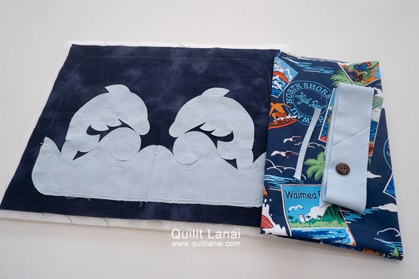 ・モチーフしつけ済み土台布 ・キルト芯 ・裏打ち布 ・ハワイアンプリント(仕切り用内布) ・パイピング用布 ・仕立て済みループ ・ココナッツボタン ・作り方説明書 ・キルトライン図