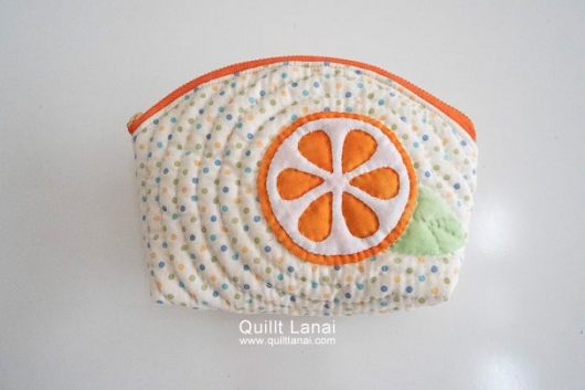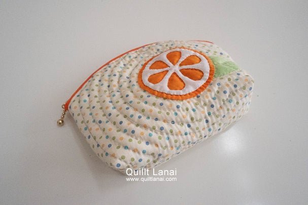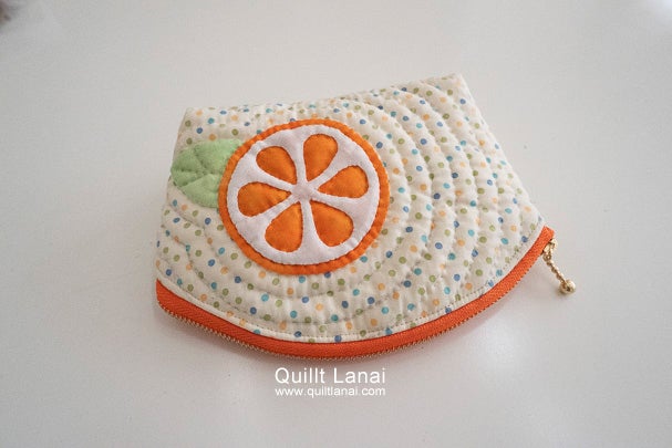 土台布に可愛いドットプリントを使用したみかんのポーチのセット済みキットです。モチーフと同じカラーのファスナーがアクセント!