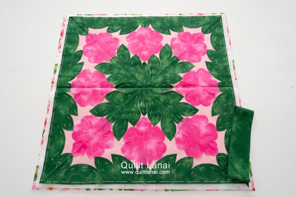 ・モチーフしつけ済み表布 ・キルト芯 ・裏打ち布(ハワイアンプリント) ・パイピング布 ・作り方説明書 ・キルトライン図。