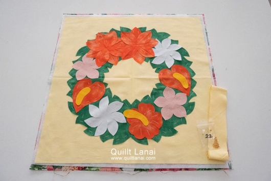・モチーフしつけ済み表布 ・キルト芯 ・裏打ち布(ハワイアンプリント) ・パイピング布 ・ビーズ ・作り方説明書 ・キルトライン図。