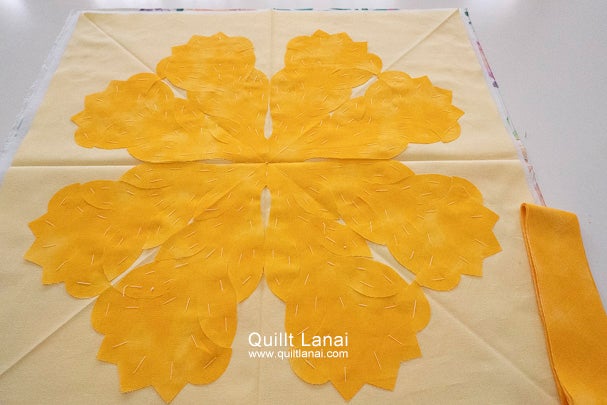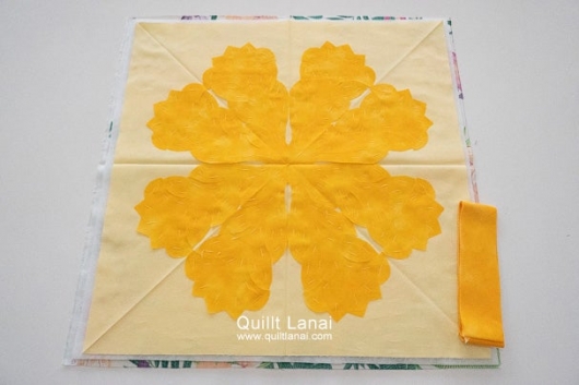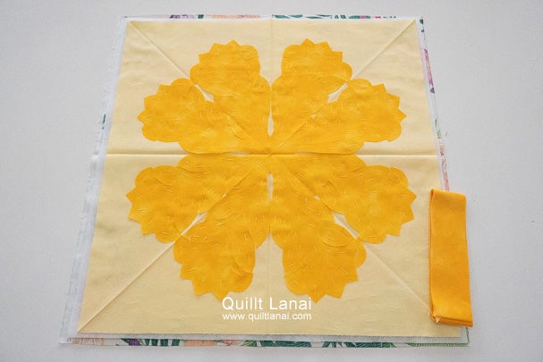 ・モチーフしつけ済み表布 ・キルト芯 ・裏打ち布(ハワイアンプリント) ・パイピング布 ・作り方説明書 ・キルトライン図。
