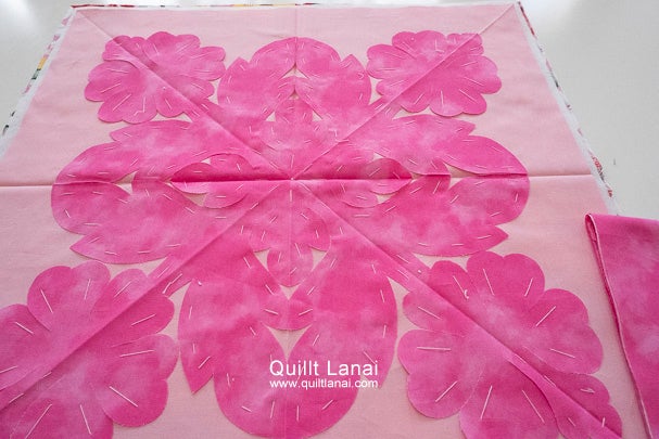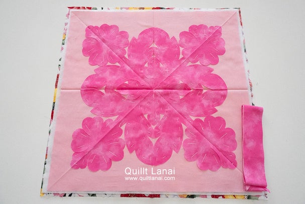 ・モチーフしつけ済み表布 ・キルト芯 ・裏打ち布(ハワイアンプリント) ・パイピング布 ・作り方説明書 ・キルトライン図。
