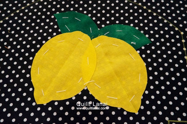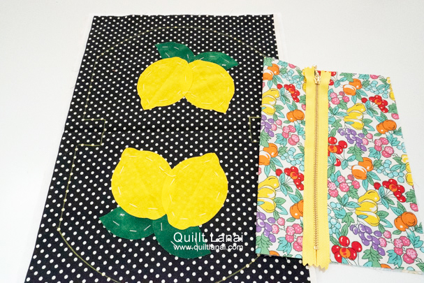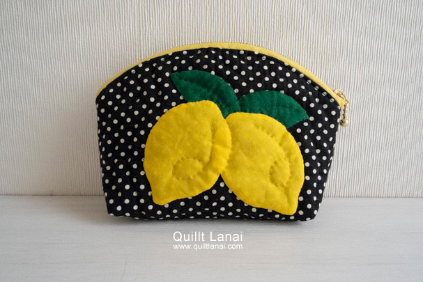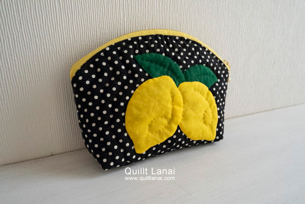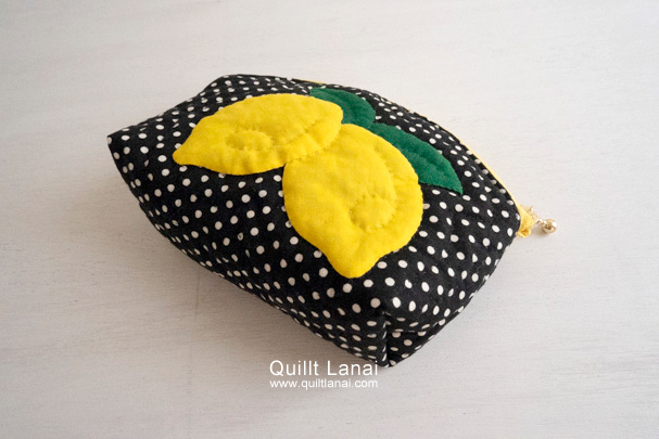土台布にドットブラックを使用したレモンのポーチのセット済みキットで す。