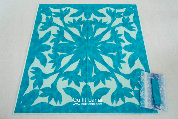 ・モチーフしつけ済み土台布 ・キルト芯 ・裏打ち布(ハワイアンプリント) ・パイピング布 ・作り方説明書 ・キルトライン図