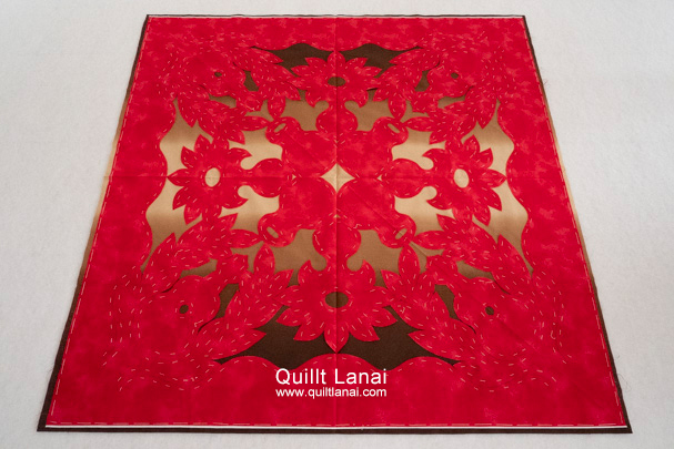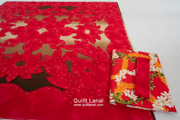 ・モチーフしつけ済み土台布 ・キルト芯 ・裏打ち布(ハワイアンプリント) ・パイピング布 ・作り方説明書 ・キルトライン図