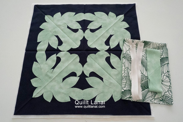・モチーフしつけ済み土台布 ・キルト芯 ・裏打ち布(生成無地) ・クッション用裏当て布(ハワイアンプリント) ・ファスナー ・パイピング用布 ・作り方説明書 ・キルトライン図