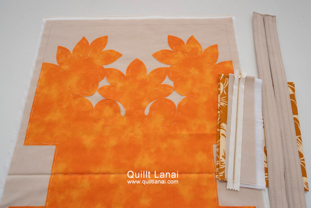 ・モチーフしつけ済み土台布 ・キルト芯 ・裏打ち布(生 成無地) ・仕立て済み持ち手 ・見返し布 ・接着芯 ・袋布用ハワイアンプリント ・ファスナー ・作り方説明書 ・キルトライン図