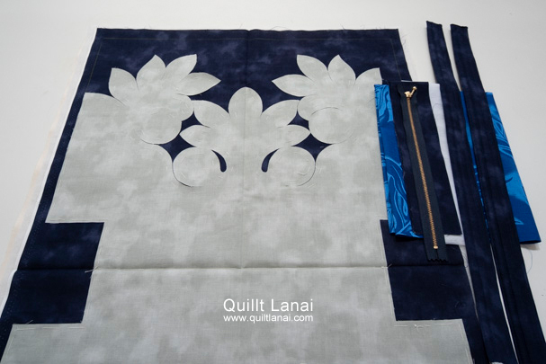 ・モチーフしつけ済み土台布 ・キルト芯 ・裏打ち布(生 成無地) ・仕立て済み持ち手 ・見返し布 ・接着芯 ・袋布用ハワイアンプリント ・ファスナー ・作り方説明書 ・キルトライン図
