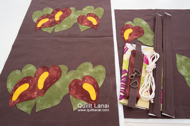・モチーフしつけ済み土台布 ・キルト芯 ・裏打ち布(生成無地) ・袋布用ハワイアンプリント ・仕立て済み持ち手 ・仕立て済みループ ・ナスカンとDカン ・パイピング(2種) ・コード ・作り方説明書 ・キルトライン図