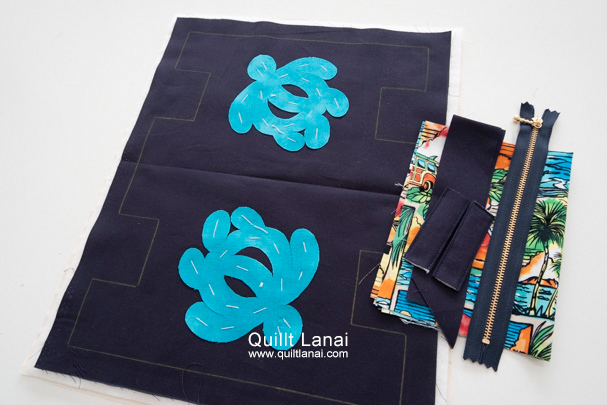 ・モチーフしつけ済み土台布 ・キルト芯 ・裏打ち布(生成無地) ・仕立て済みループ ・袋布用プリント生地 ・パイピング ・ファスナー ・作り方説明書 ・キルトライン図