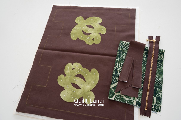 ・モチーフしつけ済み土台布 ・キルト芯 ・裏打ち布(生成無地) ・仕立て済みループ ・袋布用プリント生地 ・パイピング ・ファスナー ・作り方説明書 ・キルトライン図