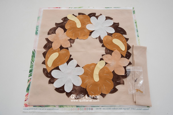 ・モチーフしつけ済み土台布 ・キルト芯 ・裏打ち布(ハ ワイアンプリント) ・パイピング布 ・ビーズ ・作り方説明書 ・キルトライン図
