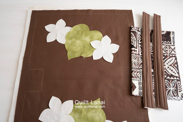 ・モチーフしつけ済み土台布 ・キルト芯 ・裏打ち布(生成無地) ・袋布用ハワイアンプリント ・仕立て済み持ち手 ・作り方説明書 ・キルトライン図