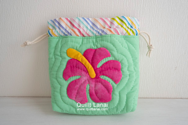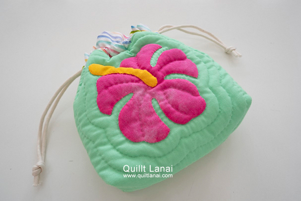 ・モチーフしつけ済み土台布 ・キルト芯 ・裏打ち布(生成無地) ・袋布用ハワイアンプリント ・ひも ・作り方説明書 ・キルトライン図
