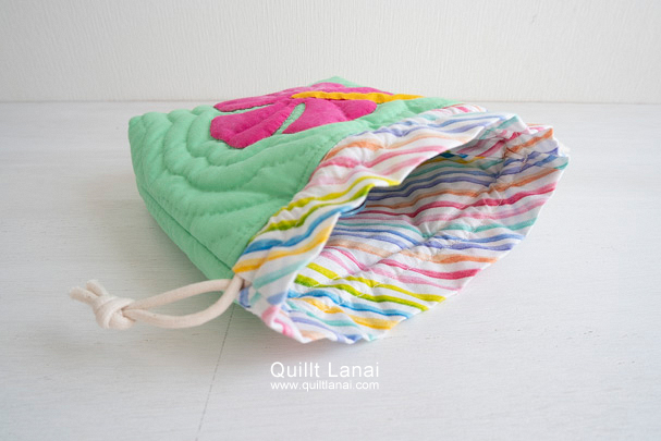 ・モチーフしつけ済み土台布 ・キルト芯 ・裏打ち布(生成無地) ・袋布用レインボーファブリック ・ひも ・作り方説明書 ・キルトライン図