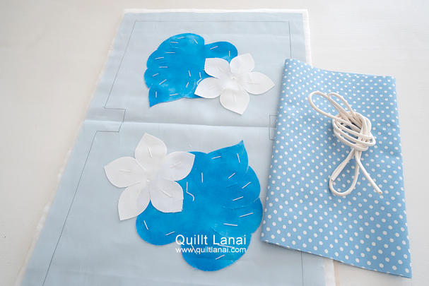 ・モチーフしつけ済み土台布 ・キルト芯 ・裏打ち布(生成無地) ・袋布用ドットプリント ・ひも ・作り方説明書 ・キルトライン図