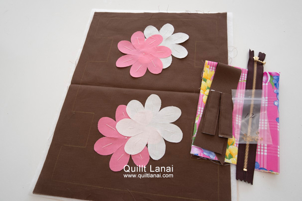 ・モチーフしつけ済み土台布 ・キルト芯 ・裏打ち布(生成無地) ・仕立て済みループ ・袋布用プリント生地 ・パイピング ・ファスナー ・ビーズ ・作り方説明書 ・キルトライン図
