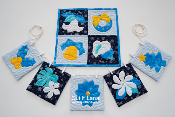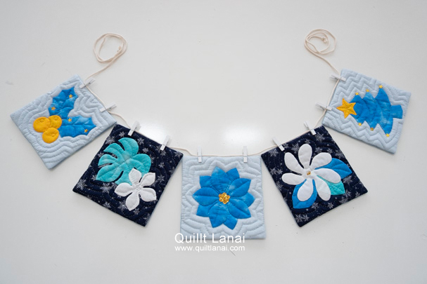 2025年のクリスマスタペストリーもうひとつは、4枚つなげたパッチーワーク風のミニタペストリーと一枚ずつ仕立てるガーランド風のハワイアンキルトです。