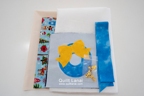 ・モチーフしつけ済み土台布(9枚) ・キルト芯 ・裏打ち布(ハワイアンプリント) ・ガーランド用裏打ち布(生成無地) ・パイピング布 ・星型スパンコール 亀甲型スパンコール ・ビーズ ・作り方説明書 ・キルトライン図