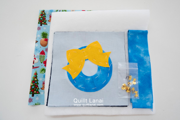 ・モチーフしつけ済み土台布(9枚) ・キルト芯 ・裏打ち布(ハワイアンプリント) ・パイピング布 ・星型スパンコール 亀甲型スパンコール ・ビーズ ・作り方説明書 ・キルトライン図
